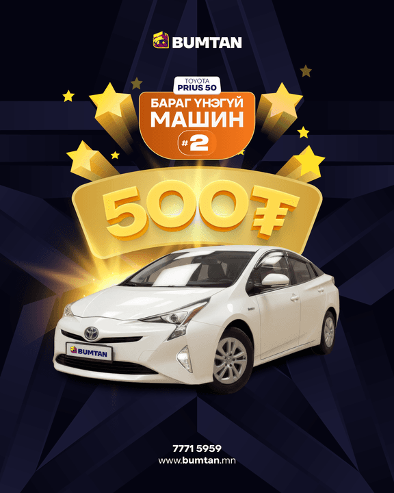 500 төгрөгөөр Приус 55 автомашин хождог сугалаа!Та энэхүү сугалааг 500 төгрөгөөр худалдан аваад Приус 55 авто машины эзэн болоорой!Нэг хүн дээд тал нь 5 сугалаа авах эрхтэй.Бараг л үнэгүй сугалаагаар баараггүй машин хож!